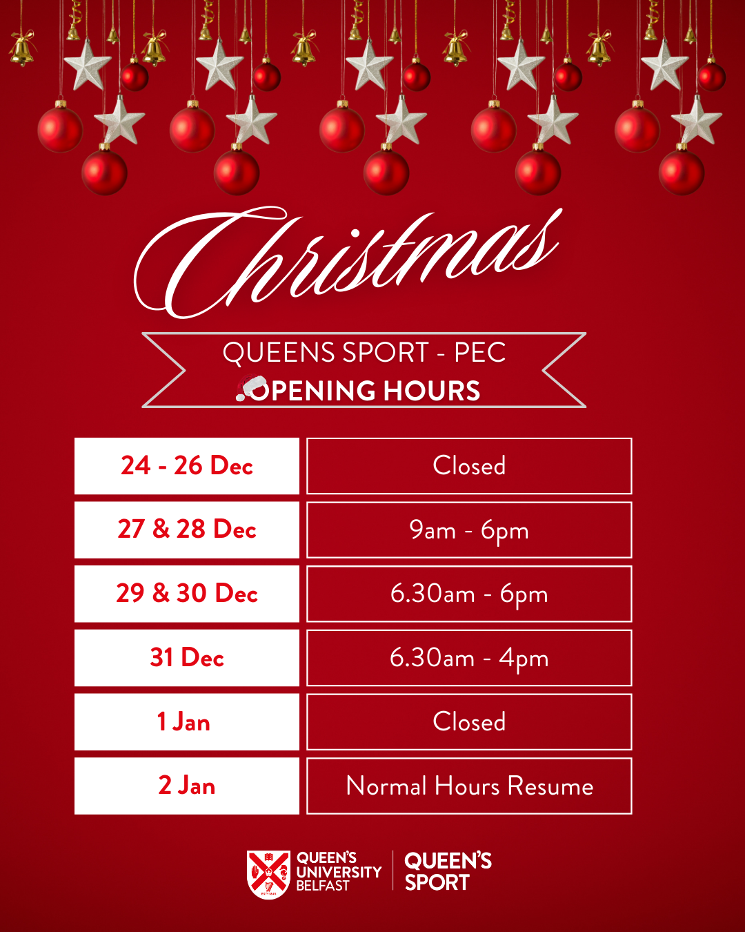 Please see below our Christmas and New Year opening hours for Queen’s Sport (PEC) and Queen’s Sport Upper Malone.