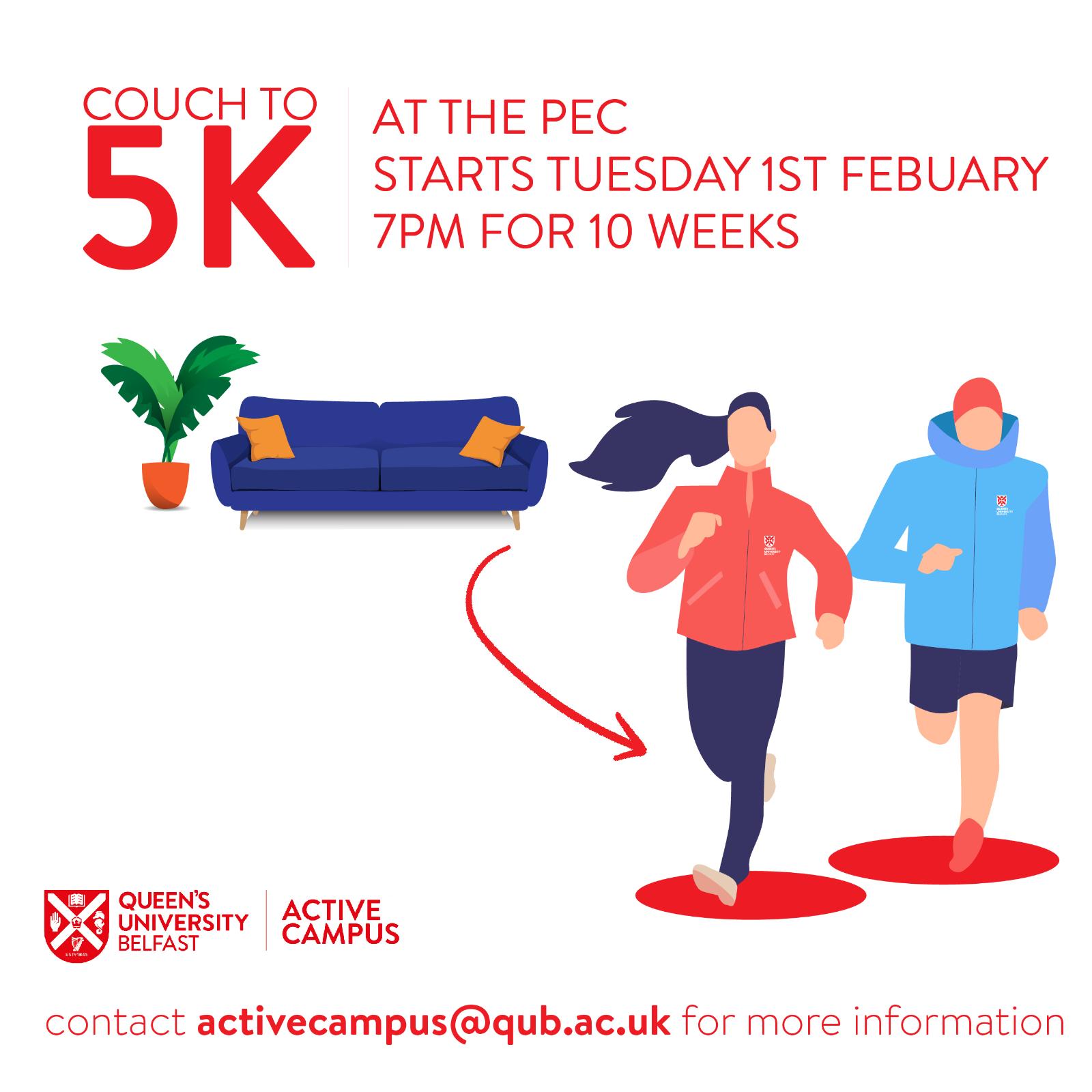 The overall aim of the Couch 2 5K programme is to provide opportunities to get active on campus in a social setting. The programme represents a structured pathway to make walking, jogging and running accessible and fun to all through a flexible 10 week group programme building up to Queen's Race Around the River.